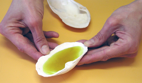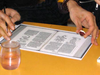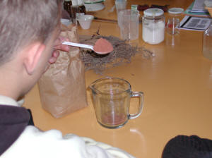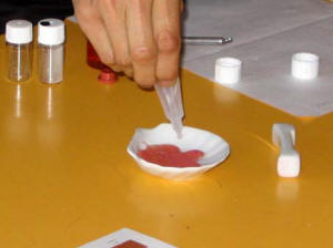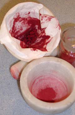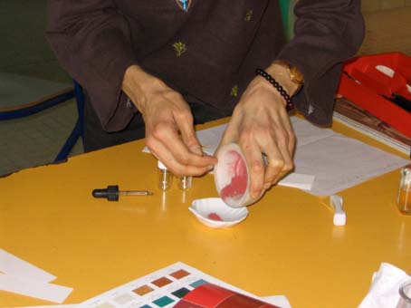 Nous broyons au mortier et recueillons la précieuse poudre colorée… |