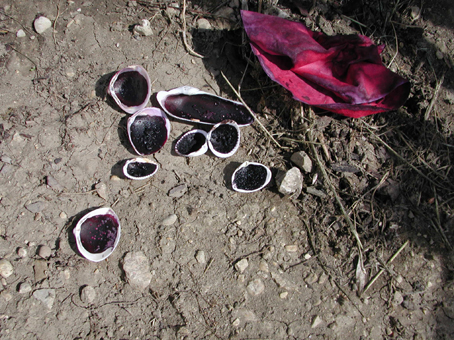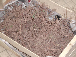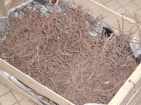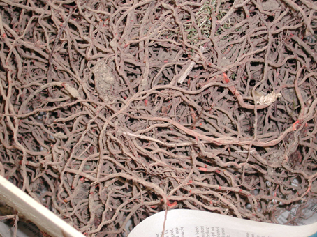 fruit de leur récolte. Les cagettes débordent de racines de garance. |